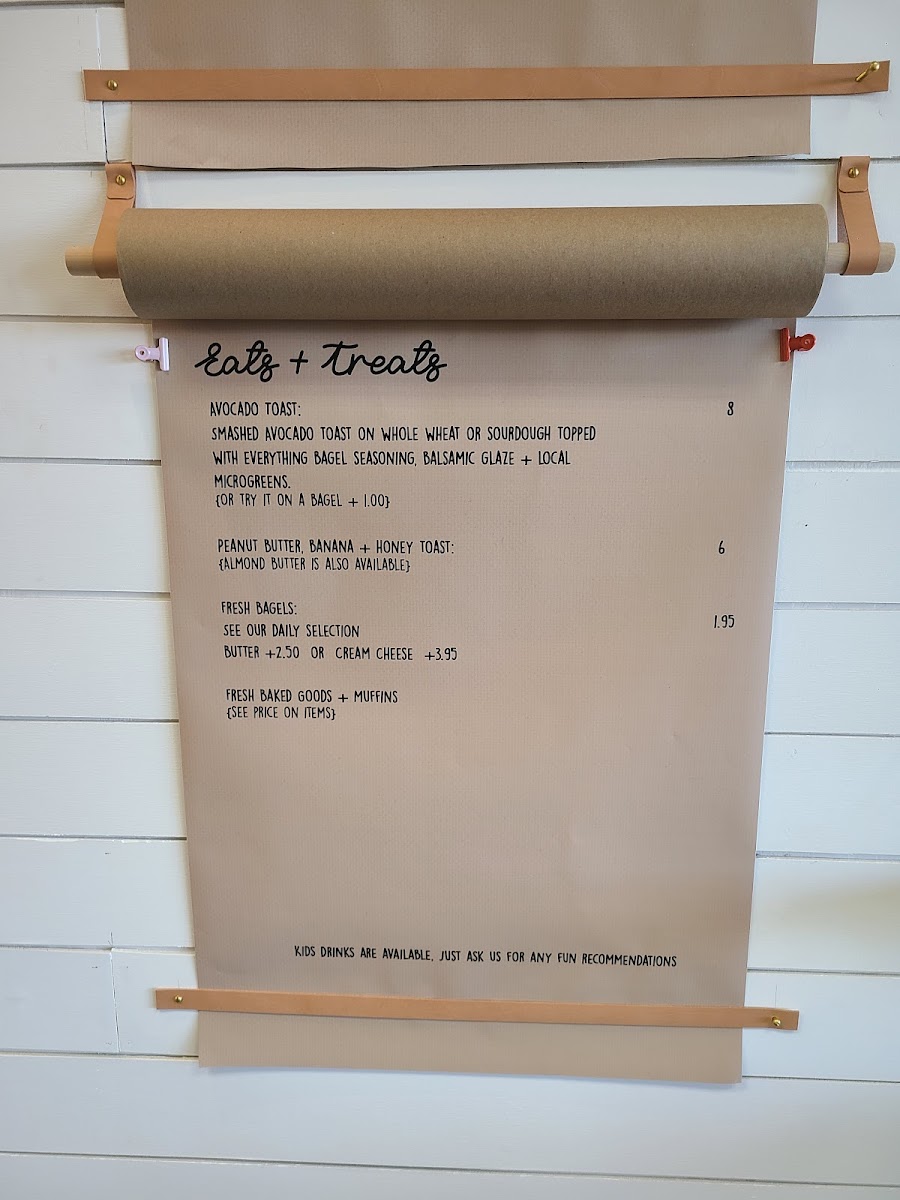 Food Items and Light Bites: The food selection includes bagel sandwiches such as the BCT Bagel Sammie, various toast options including avocado and peanut butter banana with honey, as well as yogurt bowls. There are other uncategorized items like the No Meat Sammie and cold brew available.